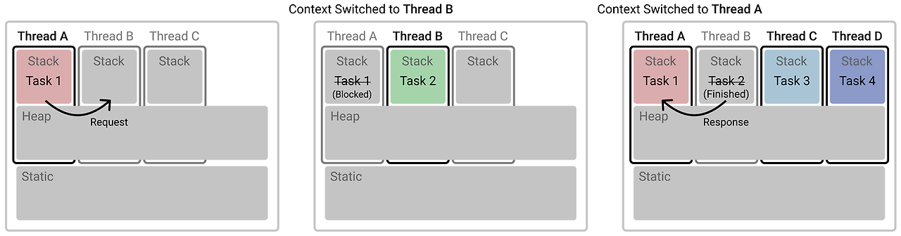 위에서 설명한 것처럼 Task1 도중에 Task2의 결과값이 필요하면 Task1이 멈추고(Blocking) Task2를 수행한다. 이러한 블로킹 과정 사이에도 다른 쓰레드는 Task를 진행한다.