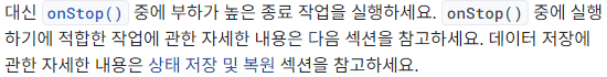 UI관련 중지작업 역시 onStop() 에서 진행하는게 좋다. onPause() 는 화면이 완전히 가려지는 것이 아니기 때문에 onPause()에서 UI중지작업을 진행하면 포커스를 옮길 때마다 UI가 사라지거나 멈추는 상황이 발생할 것이다.