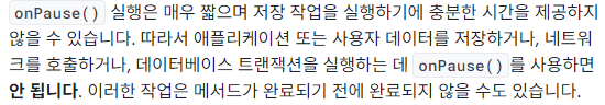 사용자의 포커스가 다른 액티비티로 이동할 때 처음 호출되는 메서드다. 호출되는 시간이 매우매우 짧기 때문에 데이터 저장, 네트워크 호출 등 무거운 작업을 수행하는데 적합하지 않다. 구글에서도 해당작업을 할당해서는 안 된다고 볼드체로 박아놨다. 해당 작업들은 아래 onStop() 메서드에 작성하는 것을 권장한다. 다만 베터리 수명에 악영향을 줄 수 있는 하드웨어나 시스템 리소스를 할당 해제하는 코드는 작성하는 것을 권장한다.