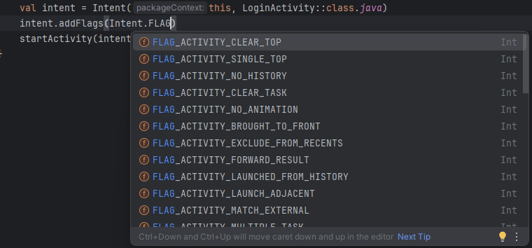 - FLAG_ACTIVITY_SINGLE_TOP: 이 플래그를 추가하면 시작하는 Activity가 singleTop 모드와 동일하게 동작한다.